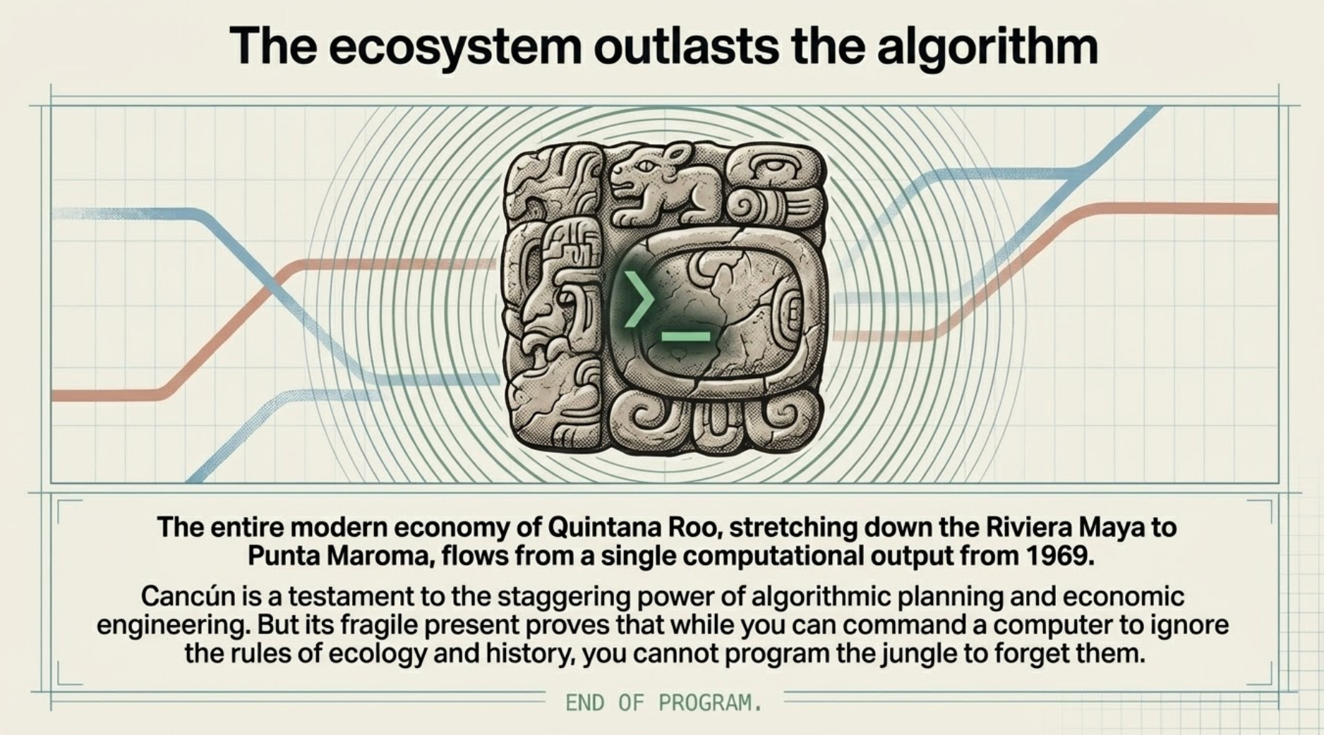 It is the absolute peak of mid-century techno-optimism. It is the belief that with enough data, you can conquer nature entirely. The algorithm did not care about the ancient Maya maritime highways. It did not care about the abandoned Spanish frontier, or the blood spilled during the Caste War in the mangroves.