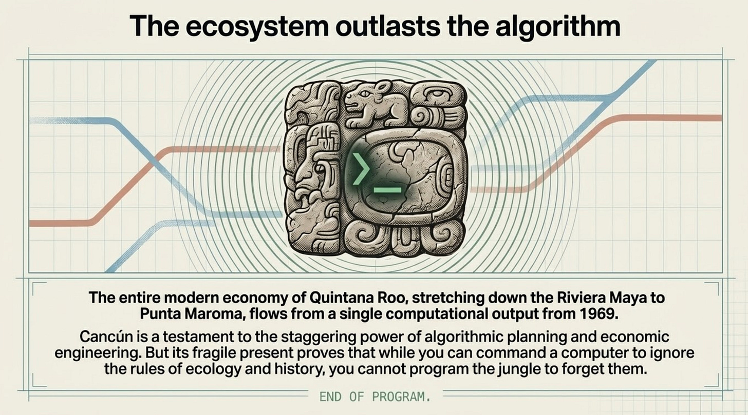 Consider that 1968 Bank of Mexico computer model again. It searched the geography solely for the parameters of infinite leisure and rapid, frictionless economic extraction. Sand quality, water temperature, flight time. These appeared to be profit-driven metrics.